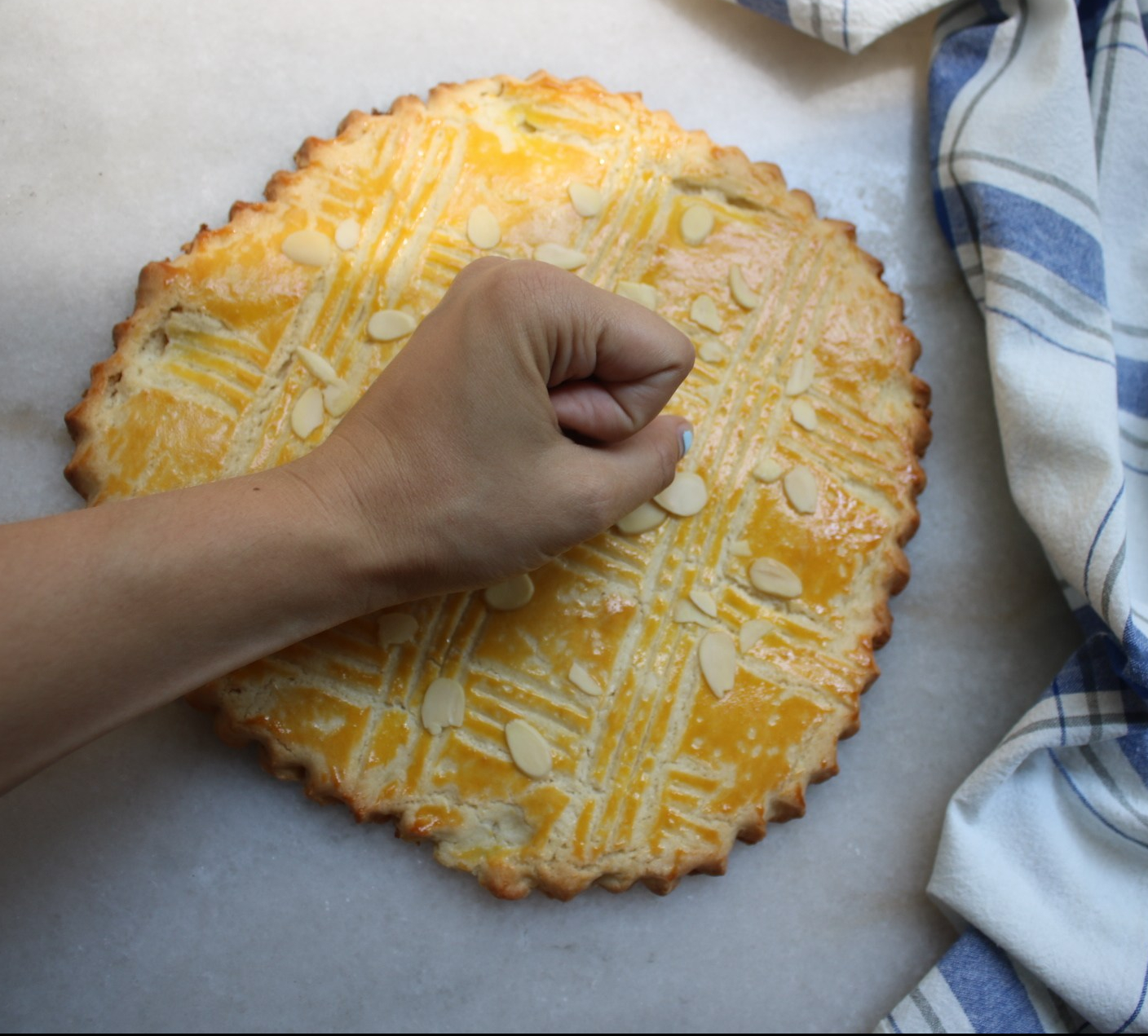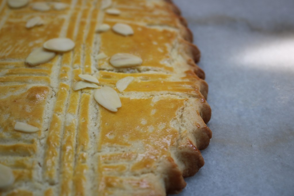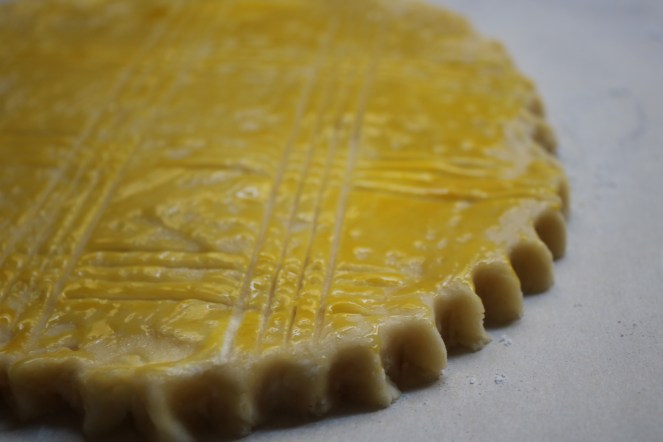 This recipe is entirely new to me – Nate’s aunt sent it to me in an adorable e-card and I just had to try it. I made a point to not research it at all before blindly following the directions. Thanks to the e-card animation, I knew it would be a flat disc of pastry with an egg wash design and some sprinkled almonds, but wasn’t sure what the texture would be like. Gotta love an air of mystery!