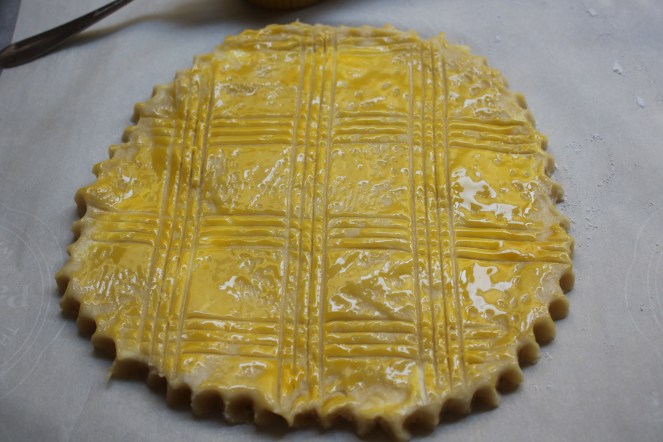 Paint the egg yolk on evenly. Make the decorative grid pattern by gently dragging the tines of a fork across the top. Sprinkle sliced almonds on top.