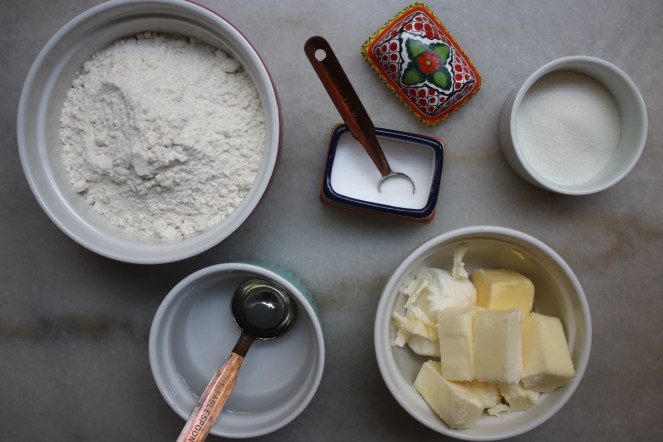 More fun facts are that shortening has a higher melting point so it’s supposed to be easier to work with (not sure how true that is during a heatwave anyway, oops) and it’s 100% fat. Butter on the other hand, is usually around a fifth water, which evaporates in the oven pushing the dough into light layers. Science is fun, y’all.