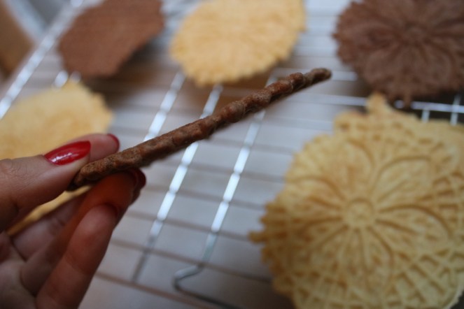 I’m now the proud owner of a pizzelle maker (thanks Alyra & Ravi!) and I’m hooked. Not only does it make adorable printed cookies, it doubles as a waffle cone maker. All you have to do is mold them into a cone shape when they’re hot off the press, and voila! Fresh ice cream cones.