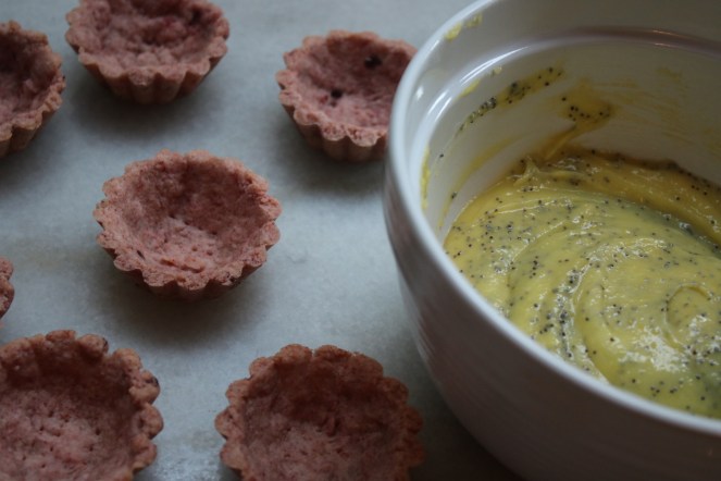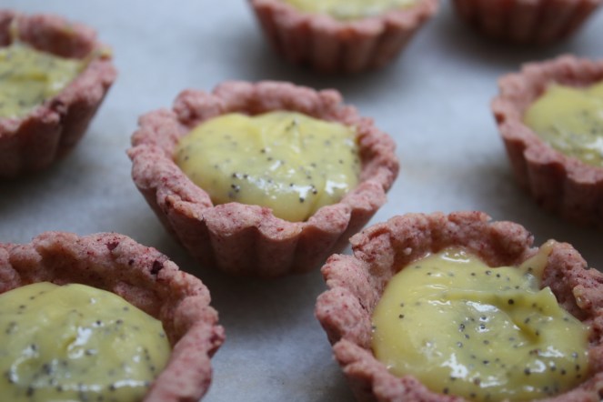 I was flipping through Erin McDowell’s The Fearless Baker and the recipe for these happy lil tartlets popped out at me. Poppy seeds in . . . lemon curd? What? After straining the curd carefully so it’s perfectly smooth and satiny, who would dare add crunchy seeds! She’s clearly crazy. But my kind of crazy, so I bookmarked the recipe (obviously.)