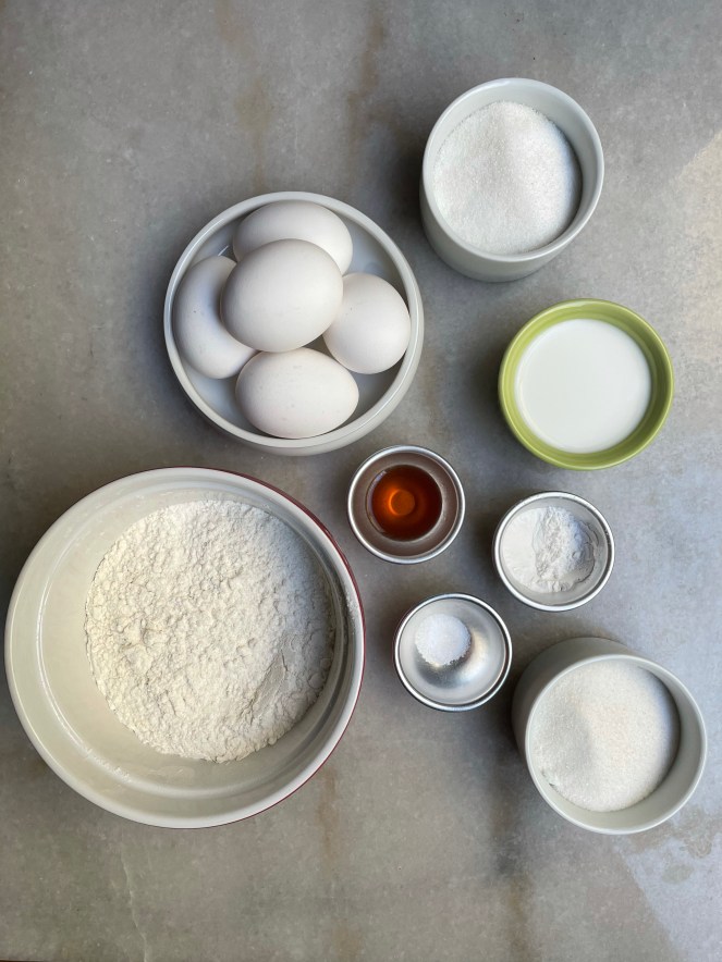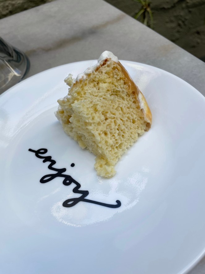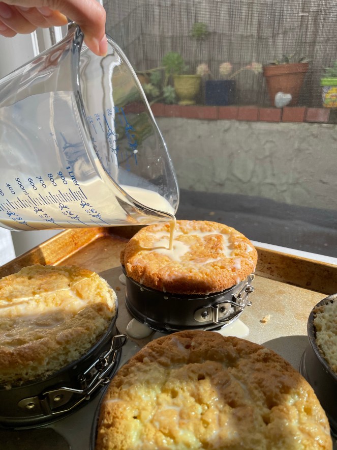 I made this one as a birthday cake for a friend and it was a pleasant surprise! The base is a chiffon cake, light and airy thanks to a large amount of whipped egg whites. Like a savarin, it’s then soaked in a sweet syrup of sorts – a mixture of whole milk, evaporated milk and sweetened condensed milk. Ta-daa, three milks! It’s like when you’re watching a show and you hear a character say the name of the episode outloud.
