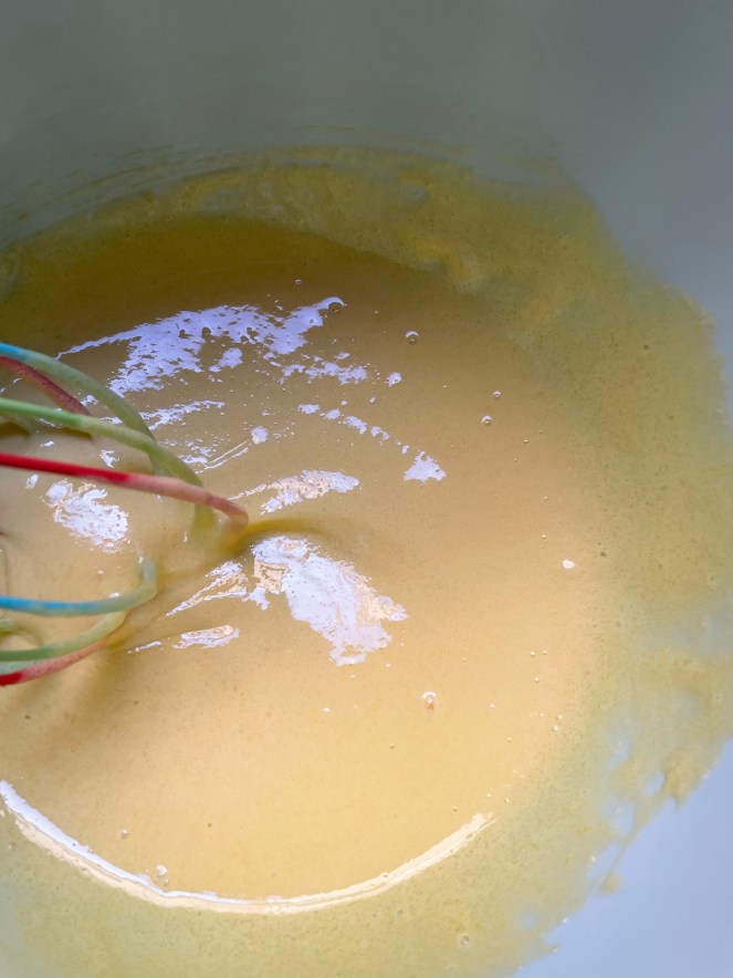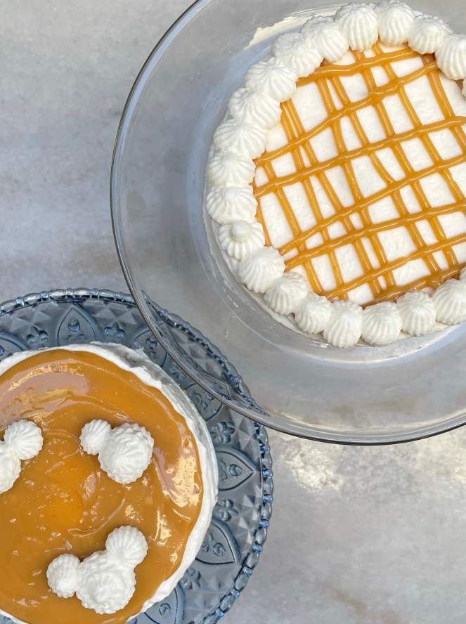 I halved the recipe that Babish lists out, simply because 10 eggs is INSANE. And a half recipe makes four mini cakes, perfect for sharing social-distance style. Since that left me with half of a can each of evaporated and sweetened condensed milk, I winged it a bit on the dulce de leche recipe, simple simmering the two together for 30-40 minutes until it had caramelized to a lovely golden color.