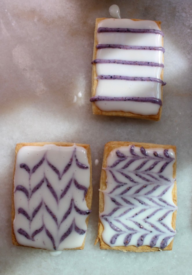 To make the purple chevron design in the icing, I ground up freeze-dried blueberries and mixed them in with a portion of my regular icing (powdered sugar and just enough milk to make it pipable.) I was definitely surprised that the result was purple, not blue, but hey it was pretty regardless!
