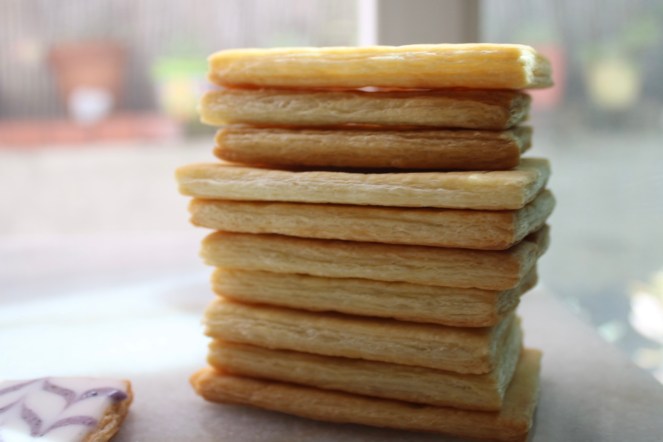 It seems incredibly counter-intuitive to bake puff pastry with a weight on top, but it worked like magic! You still get all the layers you’re craving, just more compact with smaller air bubbles in-between. Another baking tray worked perfectly as a weight.