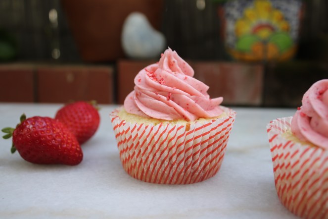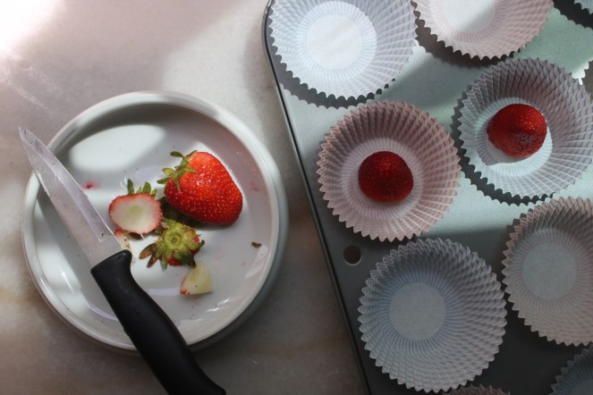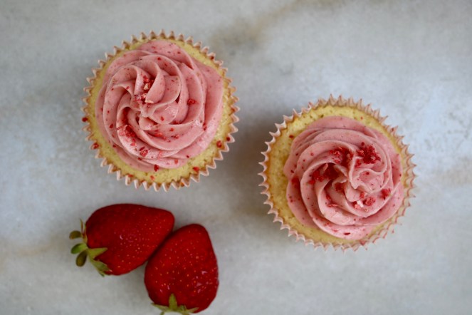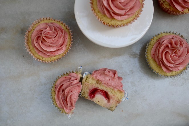 These lil cupcakes almost look like flowers themselves! I got the idea for a hidden strawberry from one of the Nadiya Bakes episodes – it just looked too fun to not try.