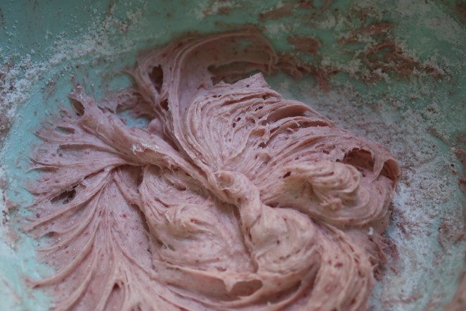 Cream cheese frosting is the tangier (and yummier, in my opinion) cousin of buttercream frosting. It has more depth of flavor, instead of just being SWEET. There are a million different recipes out there, but it’s one of the ones you can just eyeball and taste-test until it seems right to you. Start with equal amounts of softened butter and cream cheese and whip them up. Add a splash of vanilla, and enough powdered sugar (and in this case: powdered freeze-dried strawberries) for it to taste yummy and be pipeable consistency.
