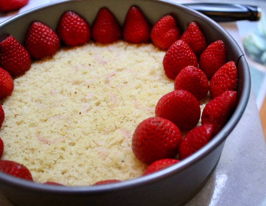 Cut some of your hulled strawberries in half and put them in timeout along the edges of the cake.