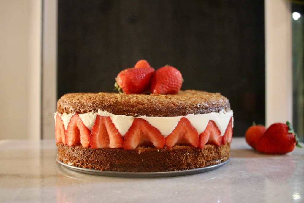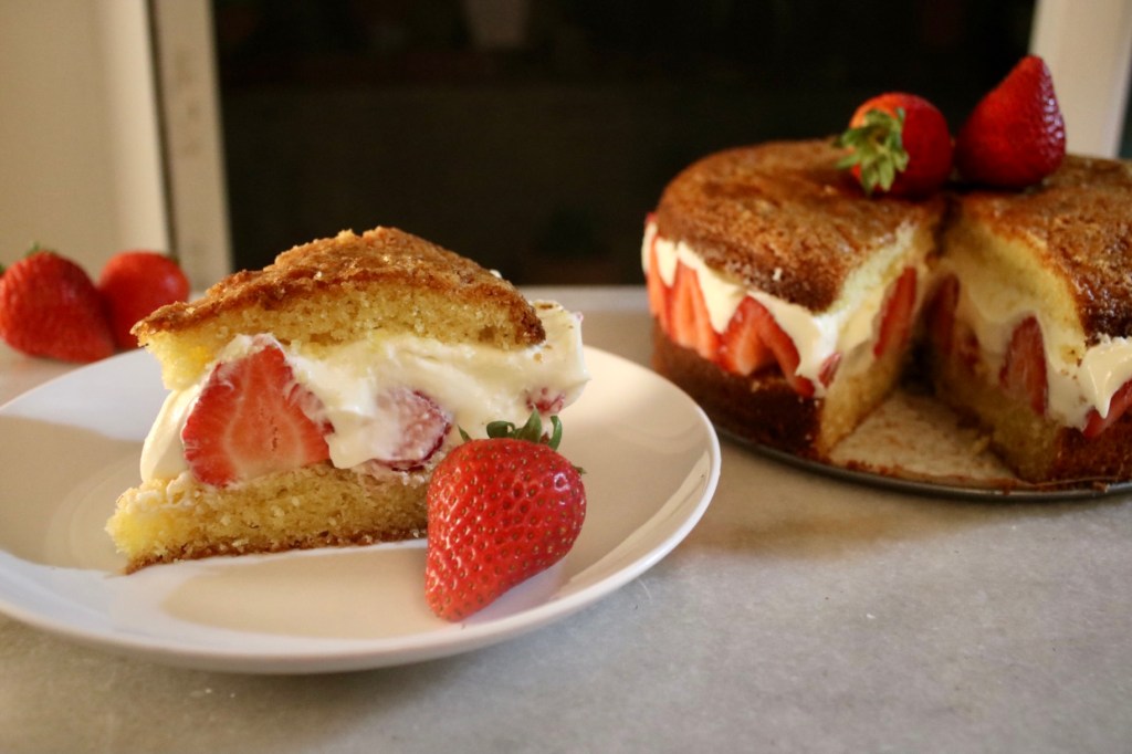 Fresh strawberries and clouds of mascarpone whipped cream sandwiched between luscious orange olive oil cake. # 225: Strawberry Cream Cake