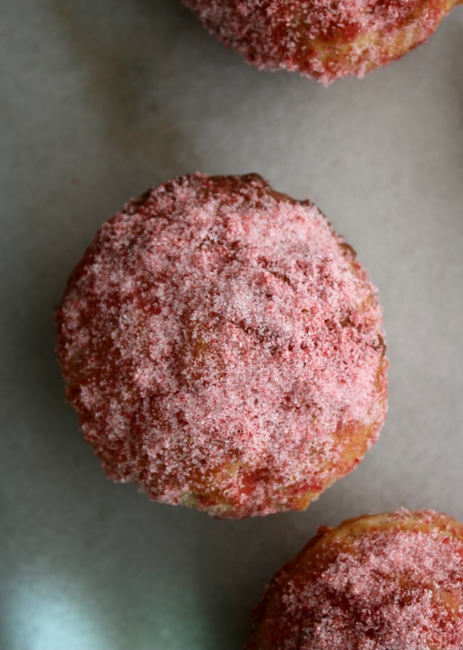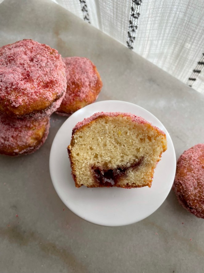 The crumb was so light and fluffy, and it had just the right amount of jam. Just a little bit in each bite, with the crunch and zing of the strawberry sugar on the outside… ooph! It made a mess but it was worth it.