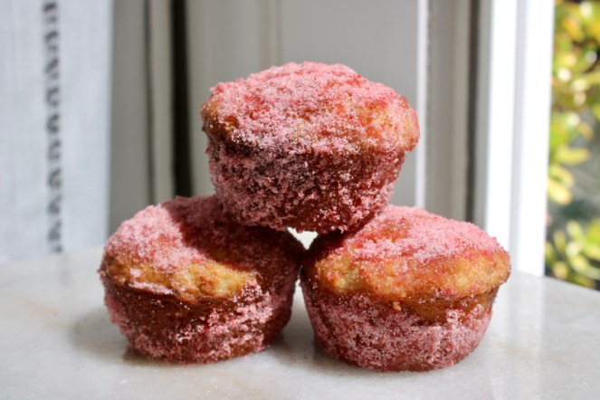 These are a happy mix of a doughnut and a muffin. Does anyone call them duffins? If not, that’s adorable and should catch on. They have the luscious sweetness of a doughnut, but are baked in a muffin tin in the oven instead of being deep-fried. (I wish that meant they are more healthy than the average muffin, but they’re literally coated in sugar. Sorry folks.)