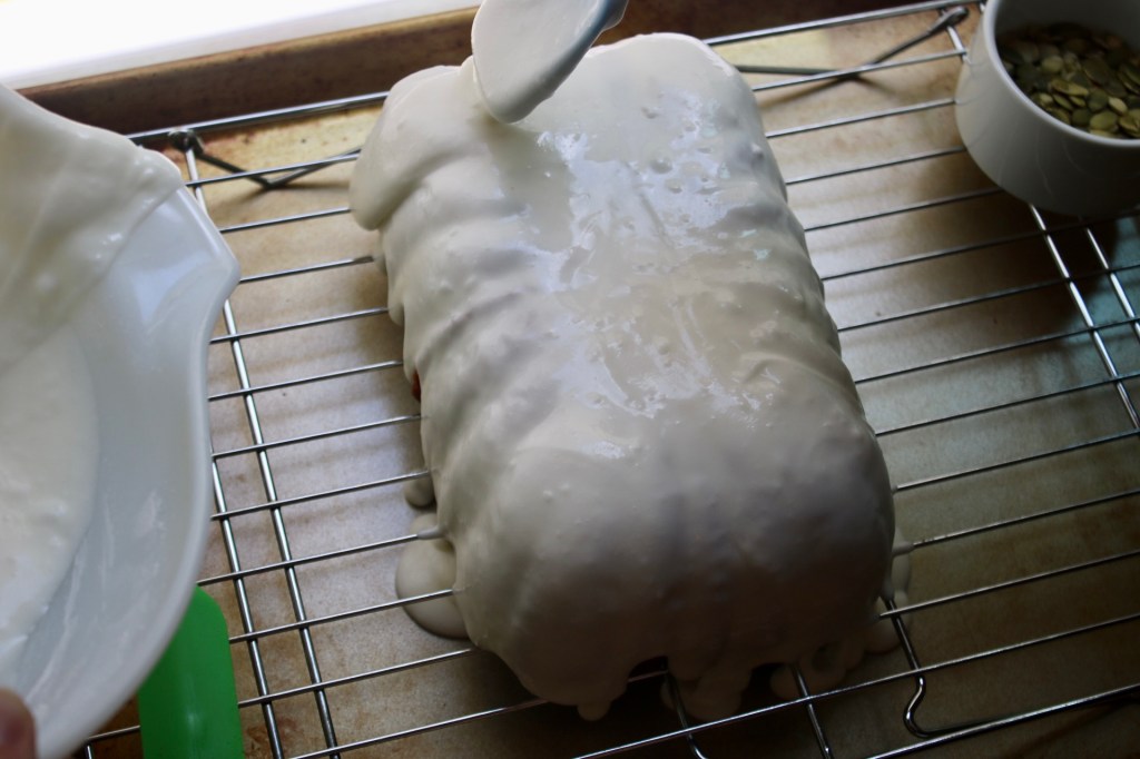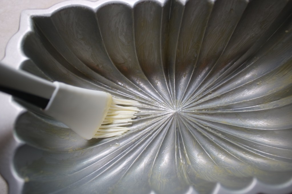 It recommended painting on melted shortening to ensure the loaf comes out with the cute pattern intact. I’m sure butter would work just as well, but since I had shortening on hand and it does have a higher fat content, the recipe won.