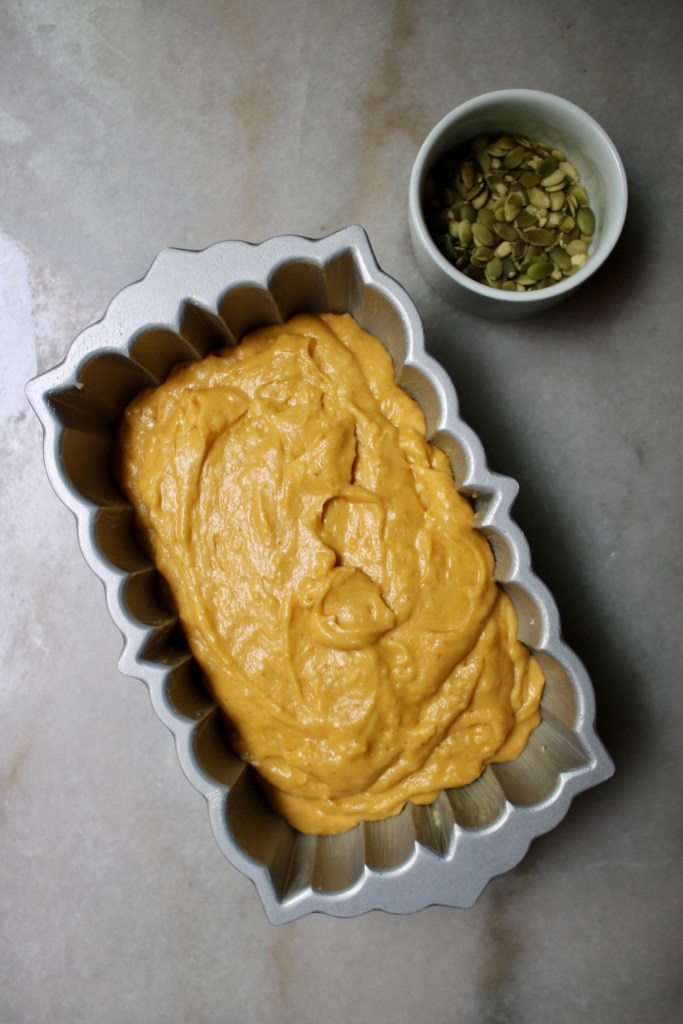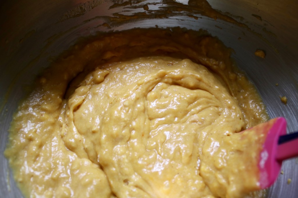 If you’re patient (it was a struggle) and mix it for the full length of time, it’ll come together into a smooth, glossy sunshine-colored batter.