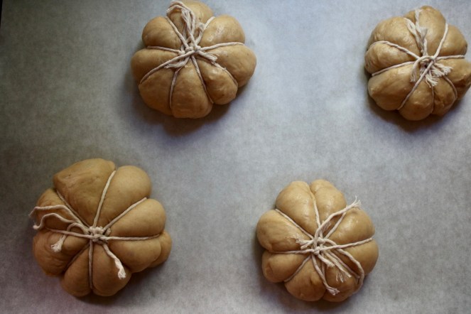 I got the idea to use bakers twine to pumpkinify some buns from Thida Bevington. They just look so cute!