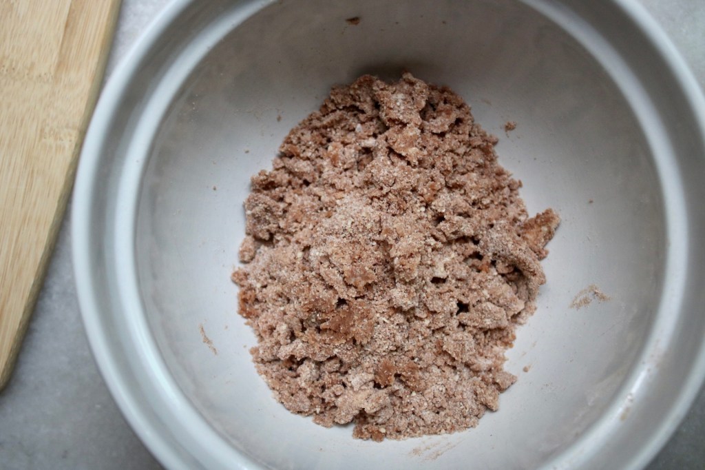 A chunkier crumble for the middle with delightful hunks of dark chocolate.