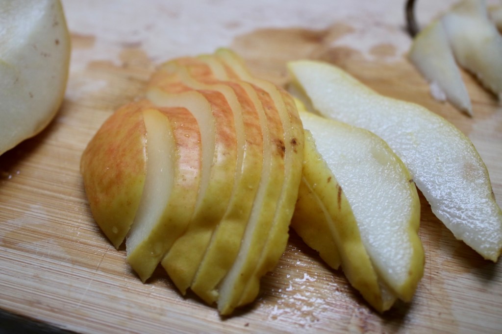 Next up: pear slices! I really liked having a singular layer, but it could also be super delicious if you chop up the pear and mix it evenly through the batter.