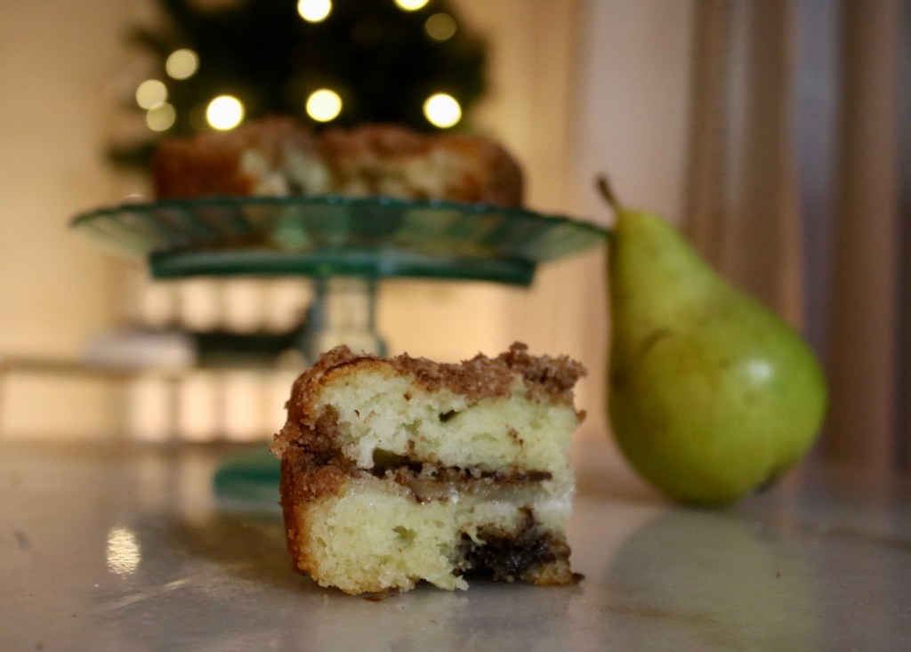 I know that coffee cake is supposed to pear (hehe not sorry) with a hot drink, but it should also be able to stand alone. This recipe not only includes almond flour in the batter (which helps to retain moisture in the crumb) but also includes one of the soggiest baking fruits out there. That sounds negative, but pears are truly just juice in a fruit shape. They almost melt into the batter, adding a subtle sweetness.
