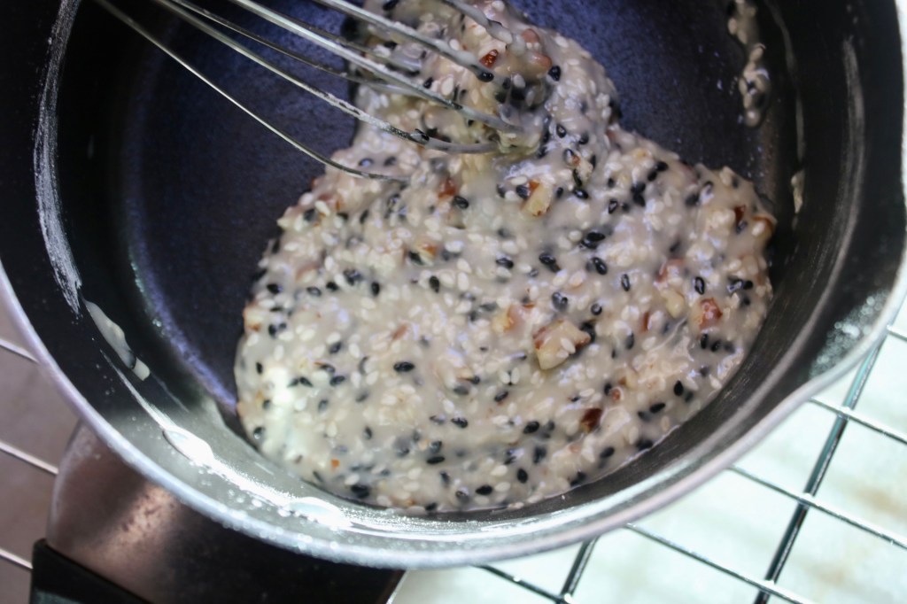 Tuiles are thin, crispy cookies that you can roll and shape to your heart’s desire. In this case, there are chopped nuts and sesame seeds mixed in for a fun texture.