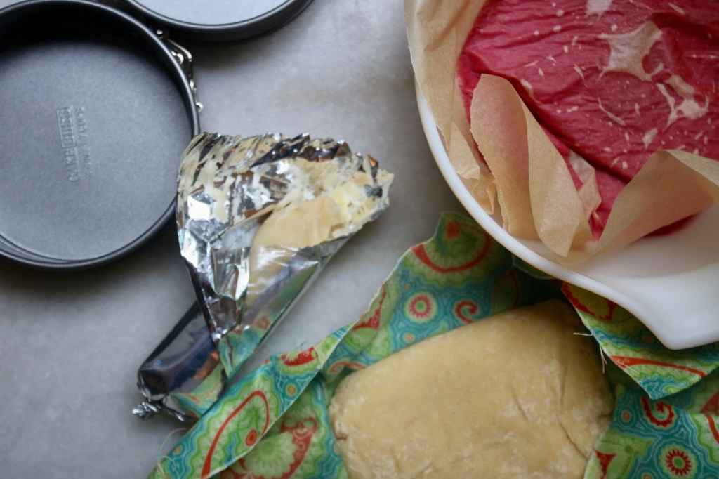 The line-up: leftover marzipan from the annual rainbow cookie bake, trusty mini springform pans, a batch of sweet tart shell crust (recipe here!), and zingy cranberry curd.