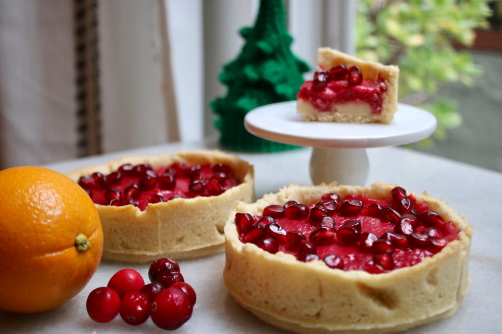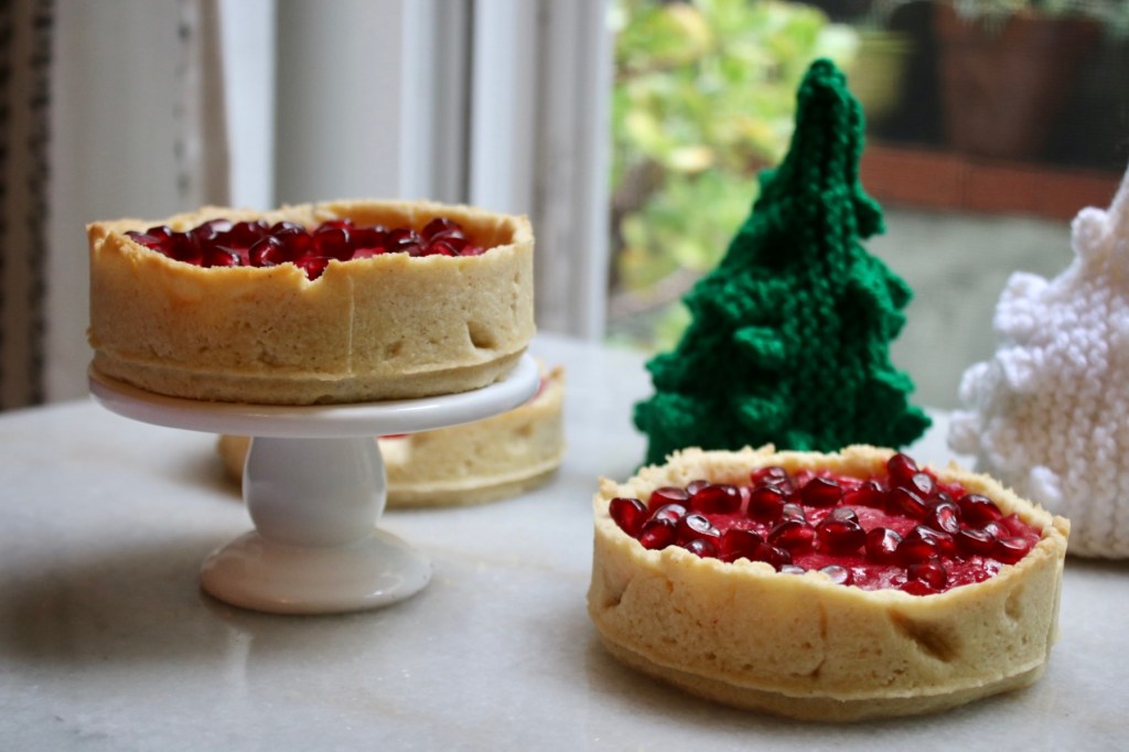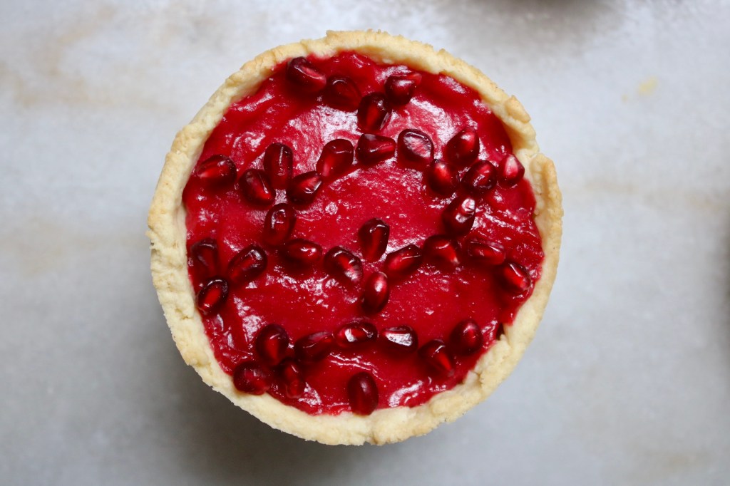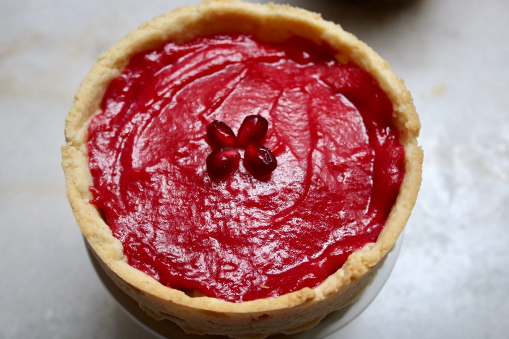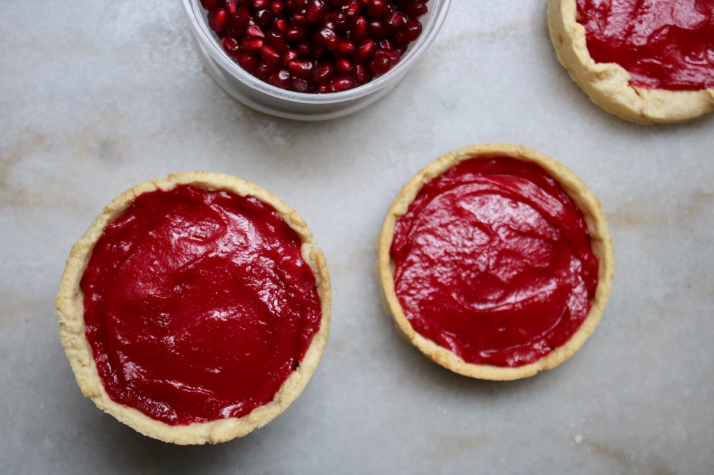 Christmas music on in the background, a pile of pomegranate seeds, and three bright red tartlets waiting to be decorated. All I was missing was snow drifting past the window! The rain helped with the ambiance a little, but you know, not the same.