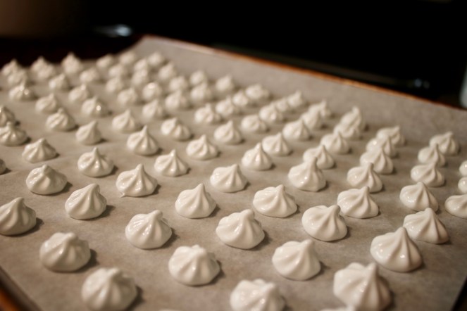 The dough only uses egg yolks, which is perfect since you can use the leftover egg whites to make the meringue garnishes! Warning: two egg whites will make a veritable army of mini meringues. Definitely not a bad thing, especially if you have extra dark chocolate to dip them in.
