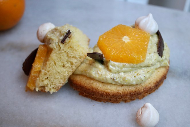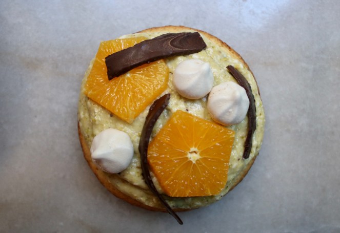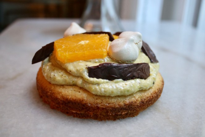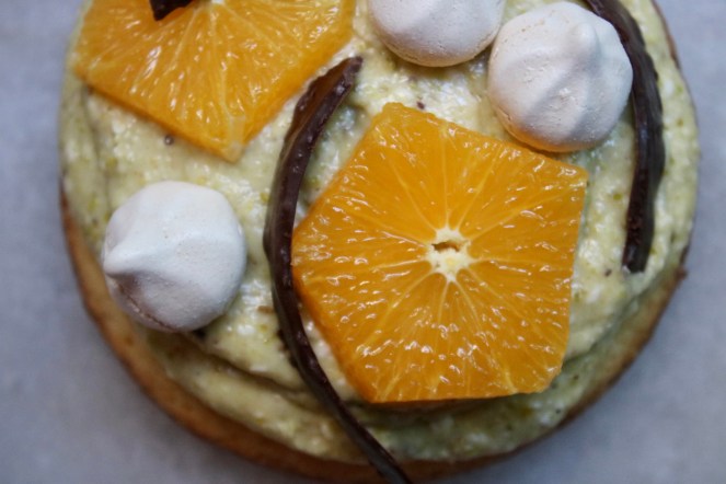 Pistachio crème mousseline, orange slices and dark chocolate atop a giant buttery cookie. # 244: Sablé Breton Tart