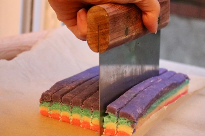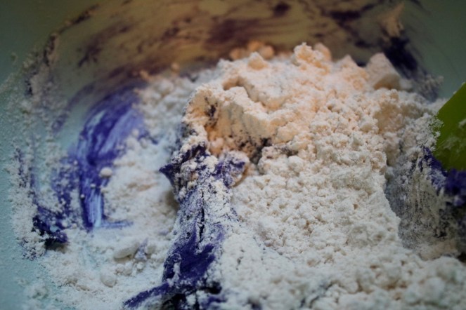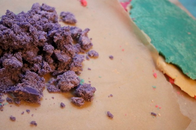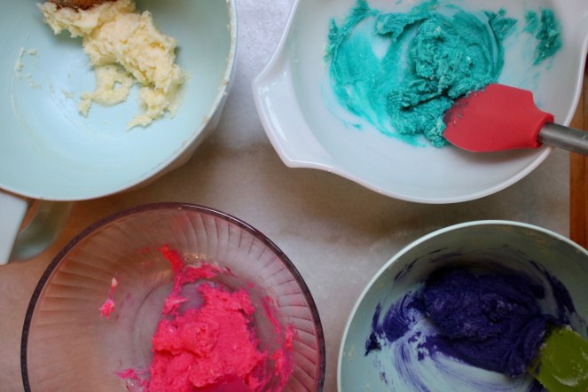 This is where the chaos comes in. Split the pre-flour dough into as many bowls as colors you’re using. You don’t want to overmix the dough once the flour is added, as that will encourage gluten formation and make you a tough cookie (literally.) Adding in the food coloring at this stage gives you the freedom to mix as much as you need to get the color to be uniform. Just remember that a little bit of food coloring goes a long way! Mine are “neon” so they’re supposed to be bright, but nothing edible should ever be that color pink or purple, oops.