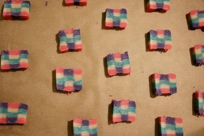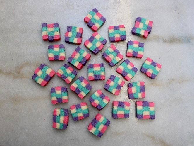 Checkerboards make me think of neat rows and even spacing. These cookies are delightful and whimsical, but neat and even? Nope. They’ve almost got some movement, like flags waving in the wind.