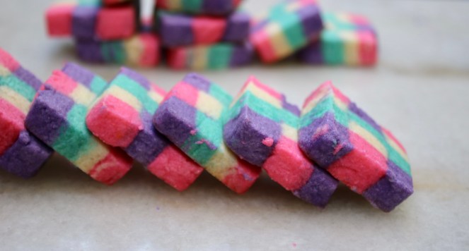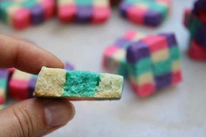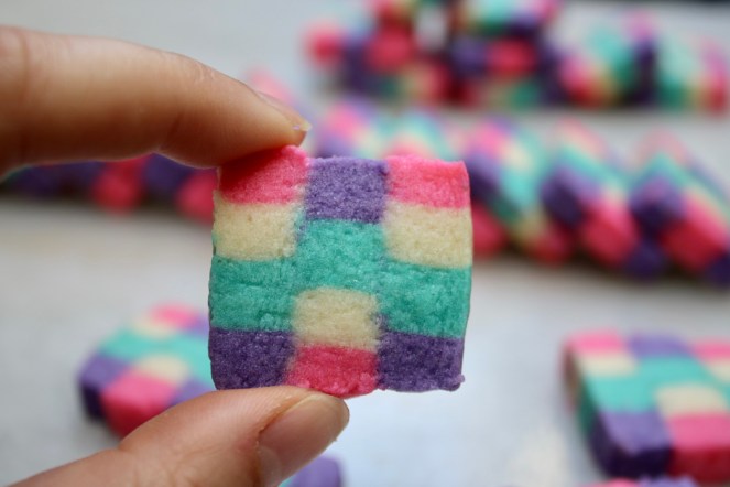 After making these, I got a sponsored video on Instagram (thanks algorithm) for a professional baker making checkerboard shortbread. They painted an egg wash between each layer to help them stick together. So smart! No gaps or sliding when slicing the cookies. Definitely keeping it in the back of my mind for next time.