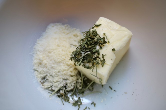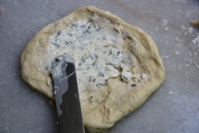Split into a dozen lil buns, flattened and painted with herby butter.