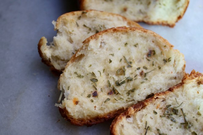 A little of the butter snuck out and made the bottom of each slice crispy and delicious. 10/10 eaten fresh, or warmed up in the toaster oven. I feel like it would also make amazing croutons, but we didn’t have any left to test that theory.