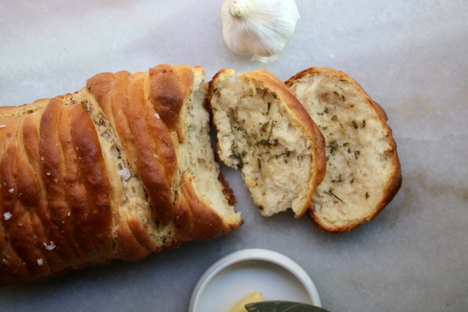 This loaf goes all-in on the garlic. Not only will you layer in garlic herb butter, but there’s also garlic powder in the dough!