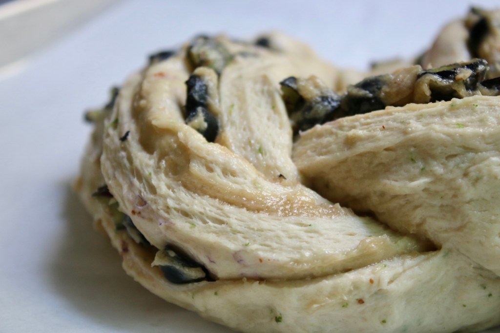 You roll it up into a log and slice it in half so you can see all the layers. Twist the stripey dough layers together to get a pretty design.