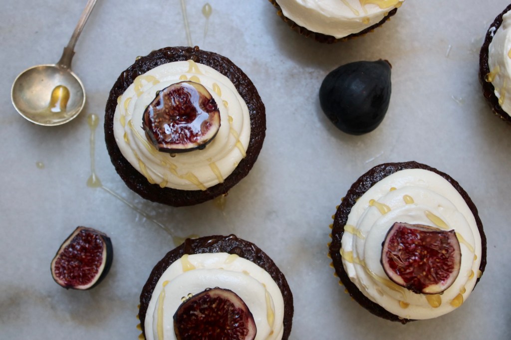Fresh figs atop a cloud of honey Italian meringue buttercream, floating over a rich dark chocolate cupcake. # 273: Honey & Fig Cupcakes