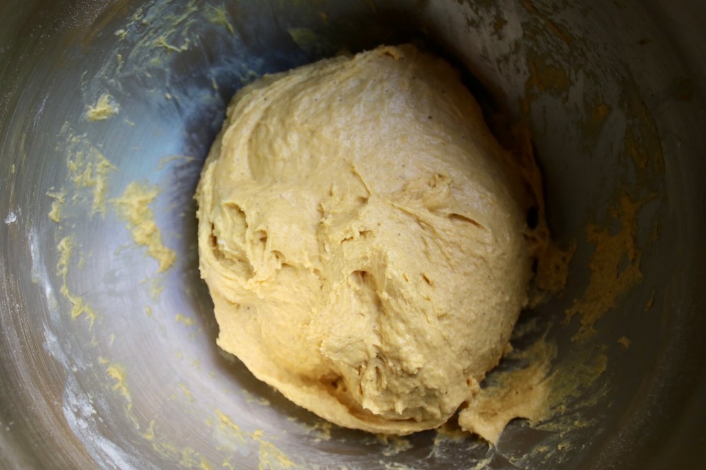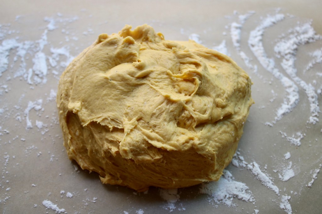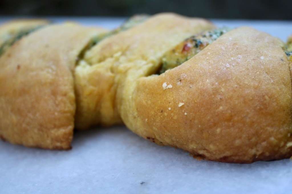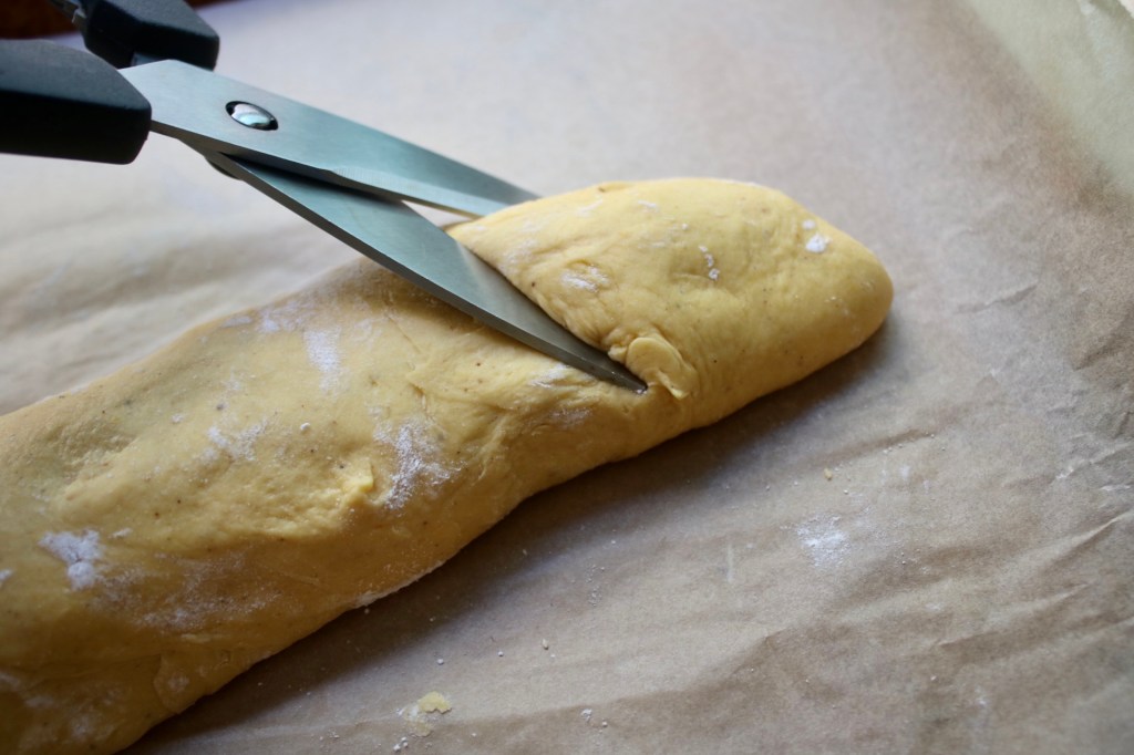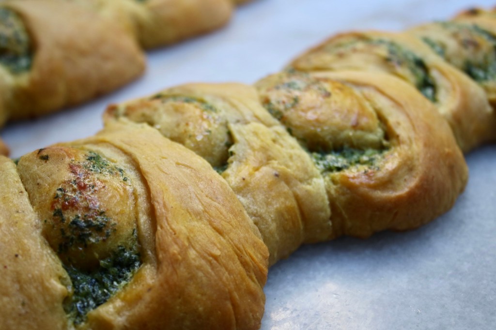 This dough sadly didn’t hold its shape as well as a classic baguette dough (my pain d’epi looked like little elf ears!) It’s enriched with milk, egg and pumpkin, leading it to bake up more like a milk bread than a crusty loaf. Despite the squishy shape, the soft crumb with melted cheese and a spinach garlic spread all tucked in was dreamy.