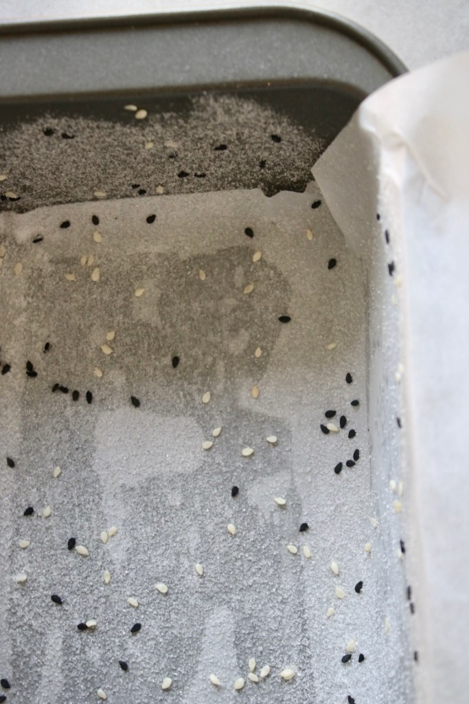 Bedecking the pan in sugar and sesame seeds for added crunch and sweetness.