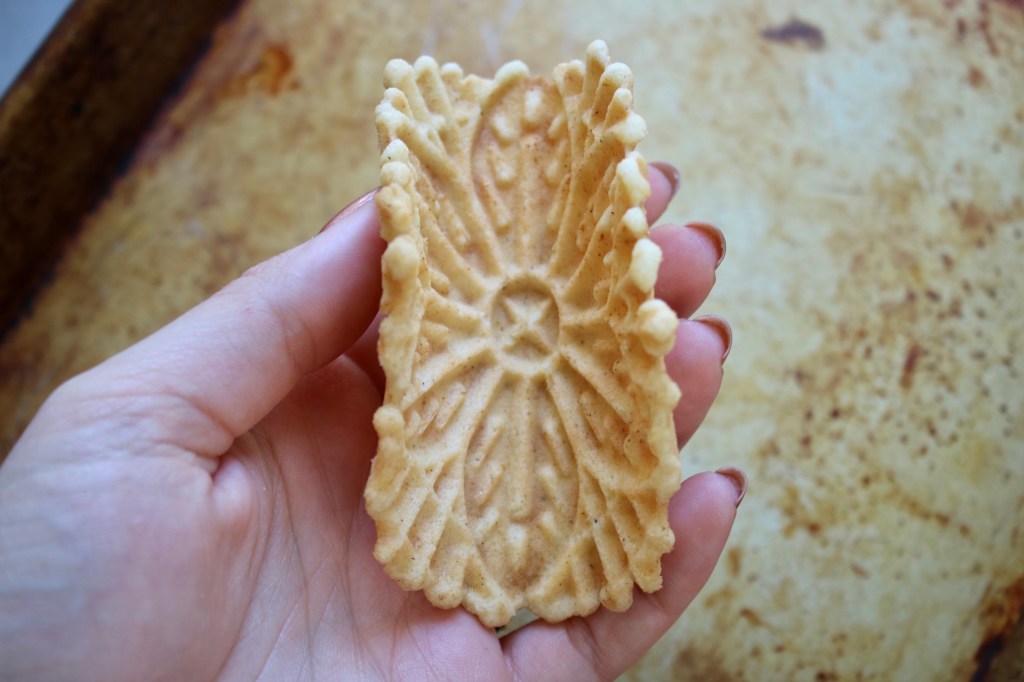 The shell is a basic waffle batter flavored with whatever floats your boat. I went with vanilla, cardamom and cinnamon this time, but the options are endless. Cocoa powder and Cointreau? Blitzed freeze-dried raspberries and almond extract? My pizzelle iron says bring it on.