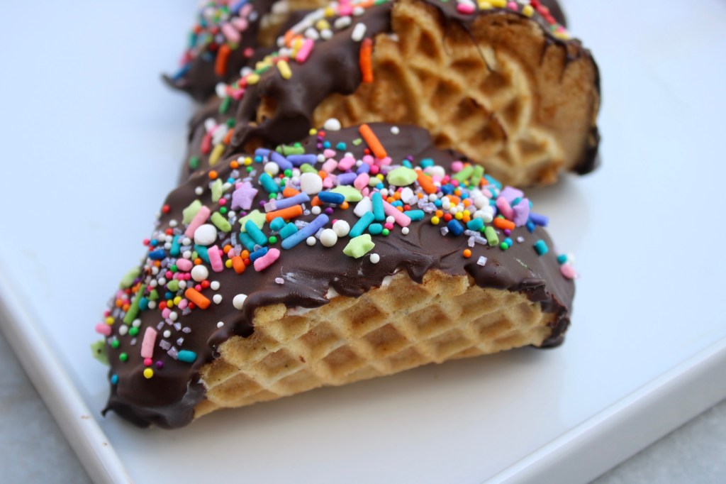 Crisp cardamom pizzelles filled with raspberry ice cream, topped with dark chocolate and sprinkles. # 296: Pizzelle Choco Tacos