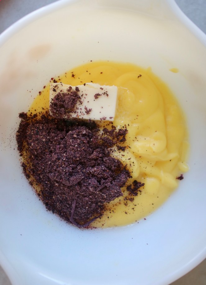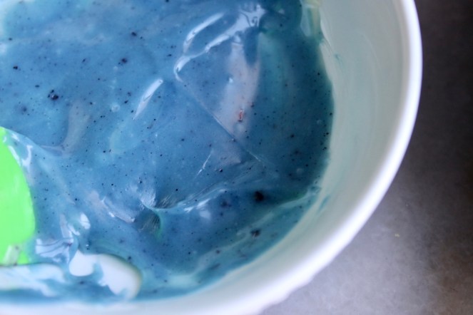 I resorted to food coloring so the glaze would swing away from purple/grey and towards a recognizable blue.