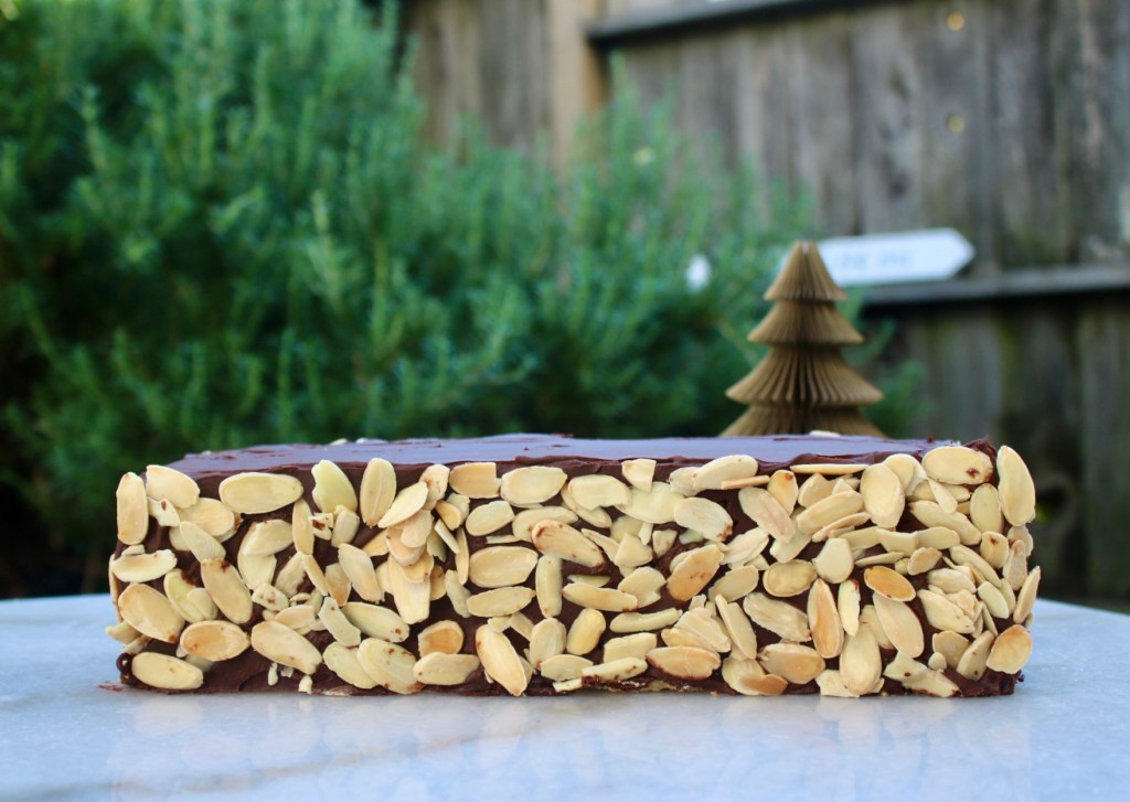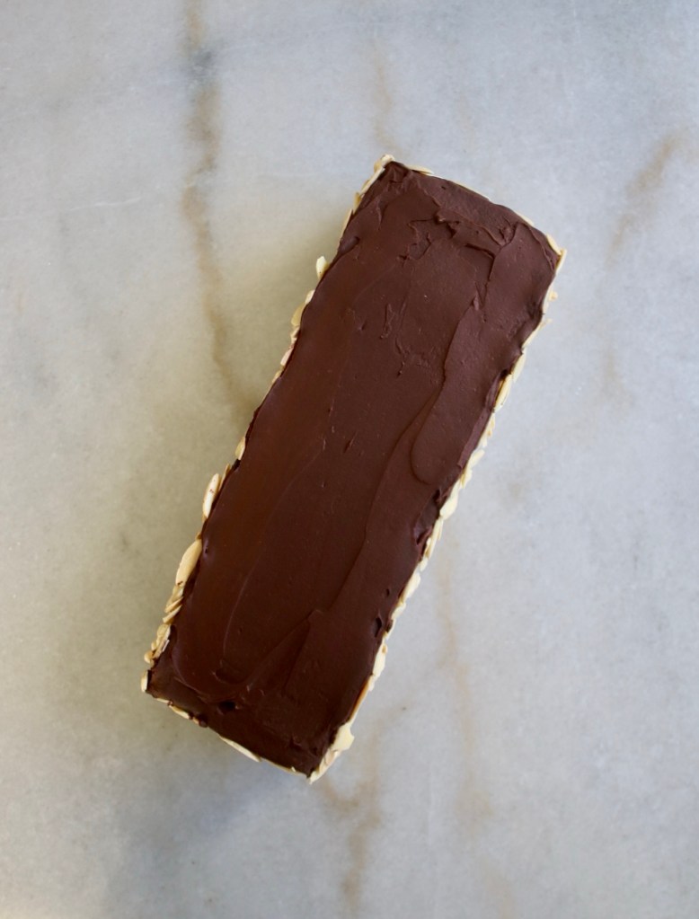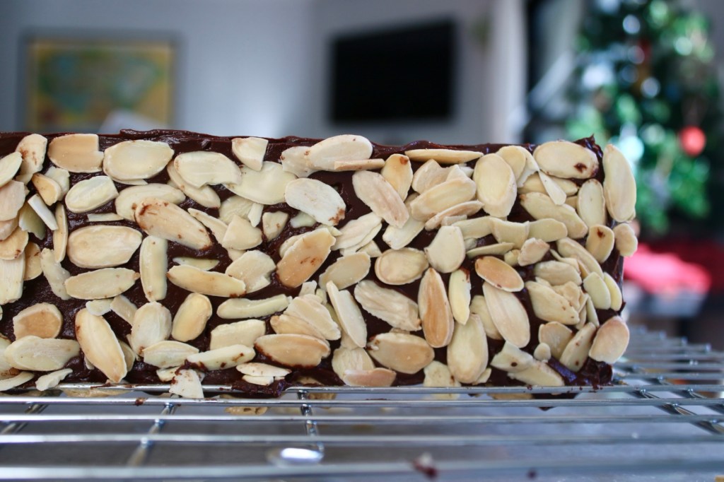 Went for the chaotic look instead of neat rows of shaved almonds. This baby has to chill for several hours before slicing and with a sunset at 4:50, I’m chasing sunlight.