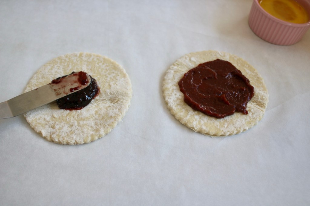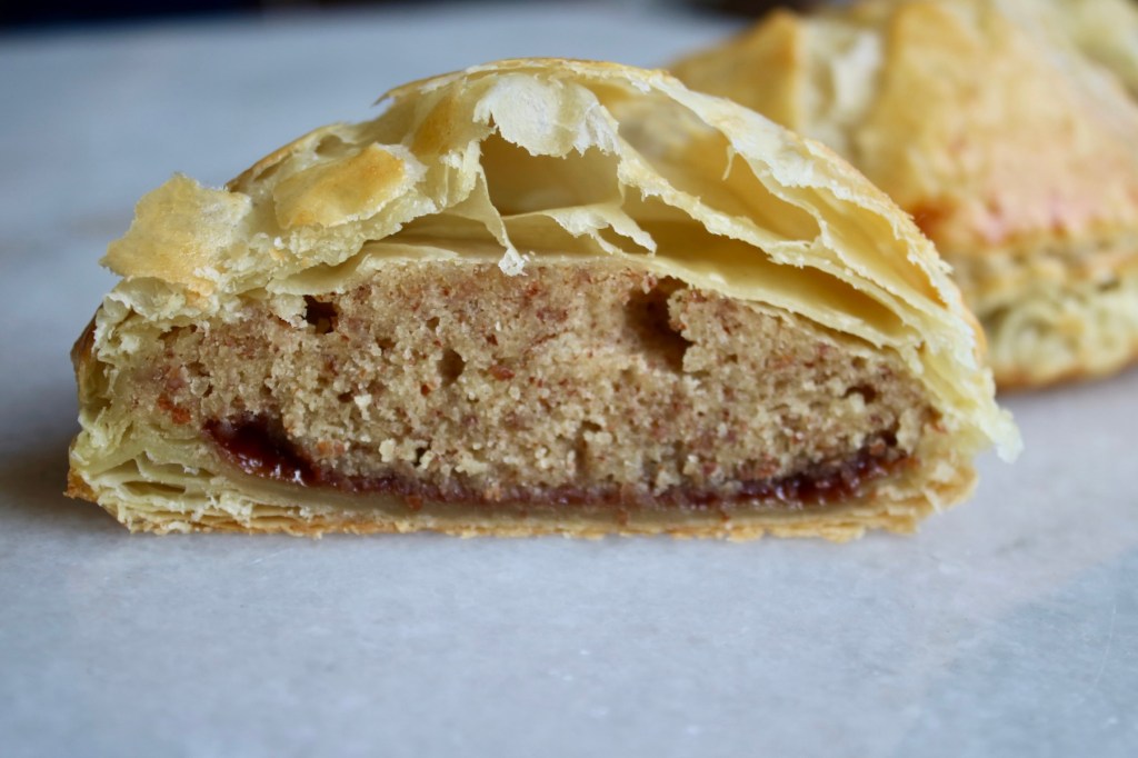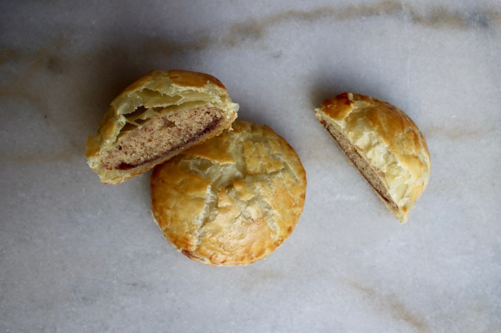 A galette des rois, or king’s cake, is a puff pastry treat served around epiphany in January. It’s filled with frangipane and traditionally has a small ceramic figure or toy baked in, which if found crowns you king for the day. My mini ones had a different kind of surprise inside: a jam layer!