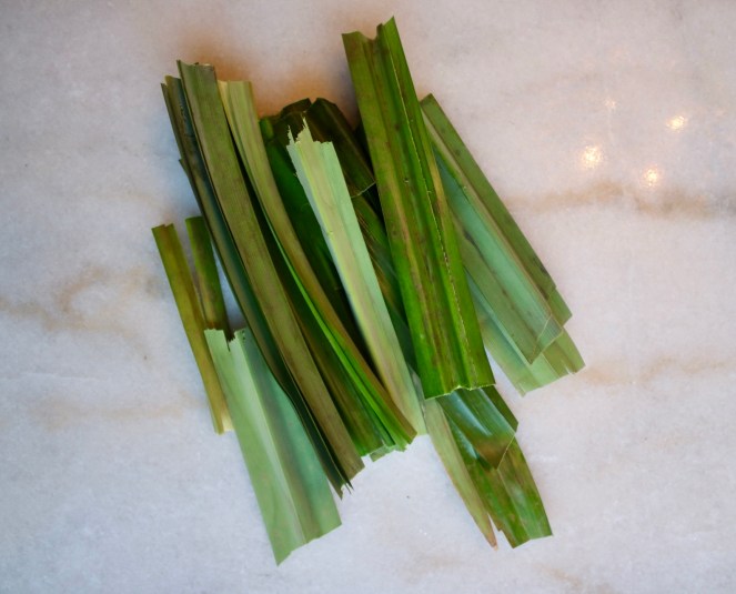 I went on a little grocery store odyssey looking for pandan extract and had to pivot to getting fresh leaves when I struck out. The extract is surprisingly easy to make on your own! It’s actually more of a concentrated juice: you blitz the leaves with water, sieve out the pulp, let the juice sit overnight, and then pour off the separated water. You’re left with a fragrant, deep green sediment that smells like sweet popcorn or coconut rice to me.