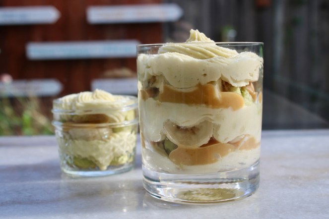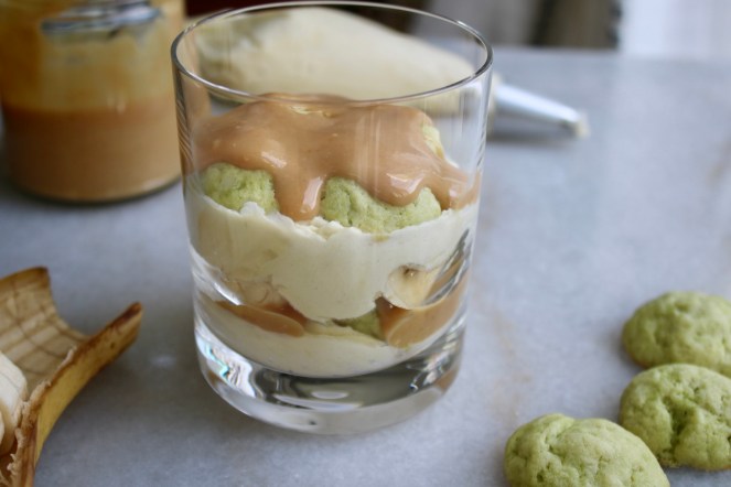 Rich coconut pastry cream layered with banana slices, miso caramel and pandan cookies. # 328: Coconut Miso Banana Pudding