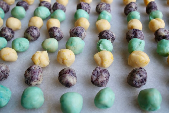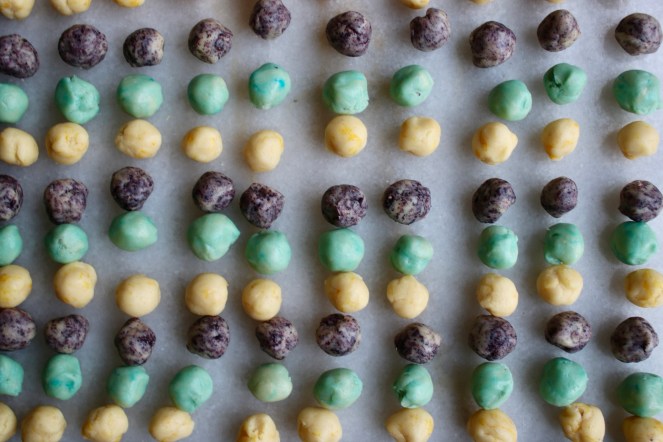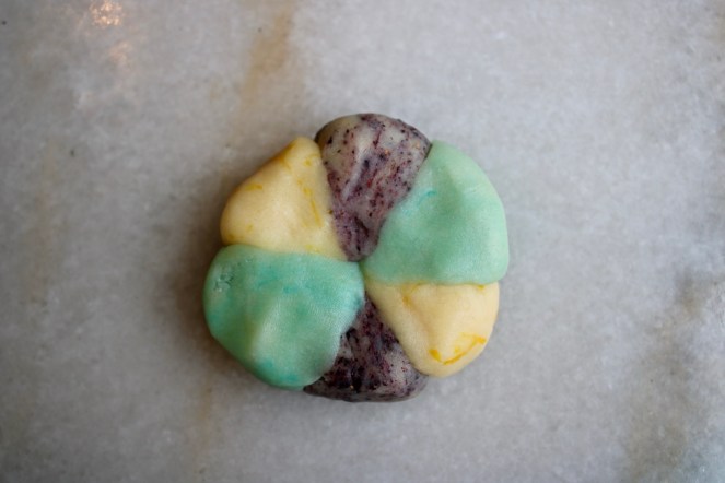 I played myself with this flavor idea: adding a syrup to only one of the three doughs threw off the texture. They all need to match so when I swirl them, the design shifts at the same rate (instead of one smearing while the others swirl nicely). I tried adding more flour and cornstarch to bring it back, but it was still stickier than the purple and yellow doughs. Womp womp.