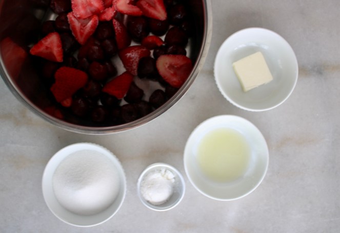 - 3/4 pound pitted cherries (I used a handful of strawberries to get to the right weight when I ran out of cherries. Continuing with the flexibility theme of this bake)