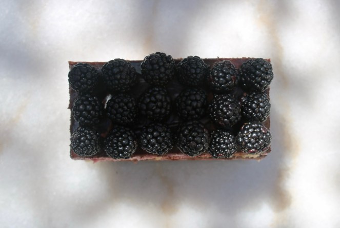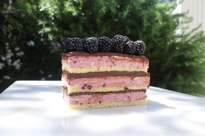 A springtime version of an opera cake, this diva of a cake is made up of chocolate ganache, blackberry swiss meringue buttercream and joconde sponge, topping it all off with a tiara of fresh blackberries.