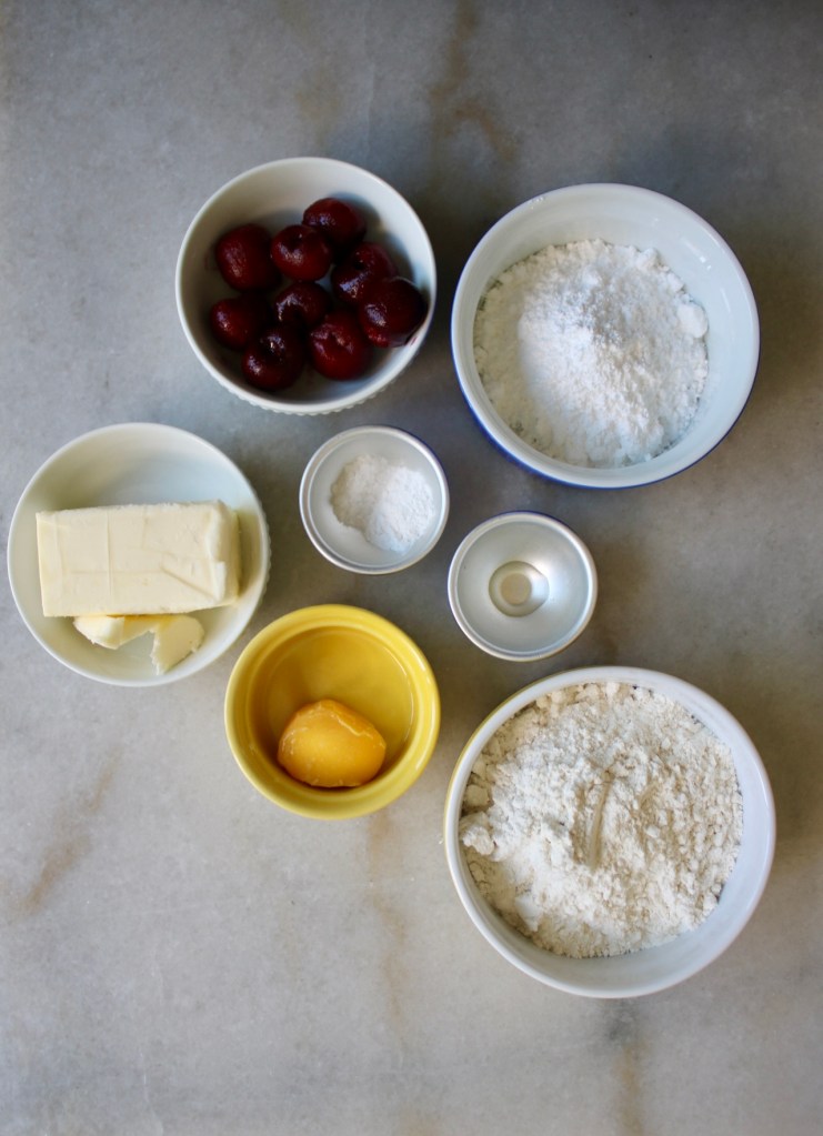 No mise en place for the jam, oops! A handful of chopped cherries cooked on low heat with a splash of lemon juice, sugar (and a sprinkle of cornstarch to appease my jam viscosity anxiety.)