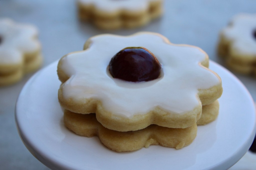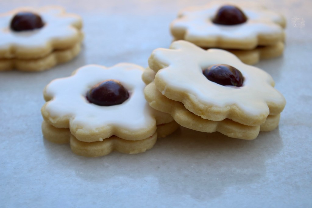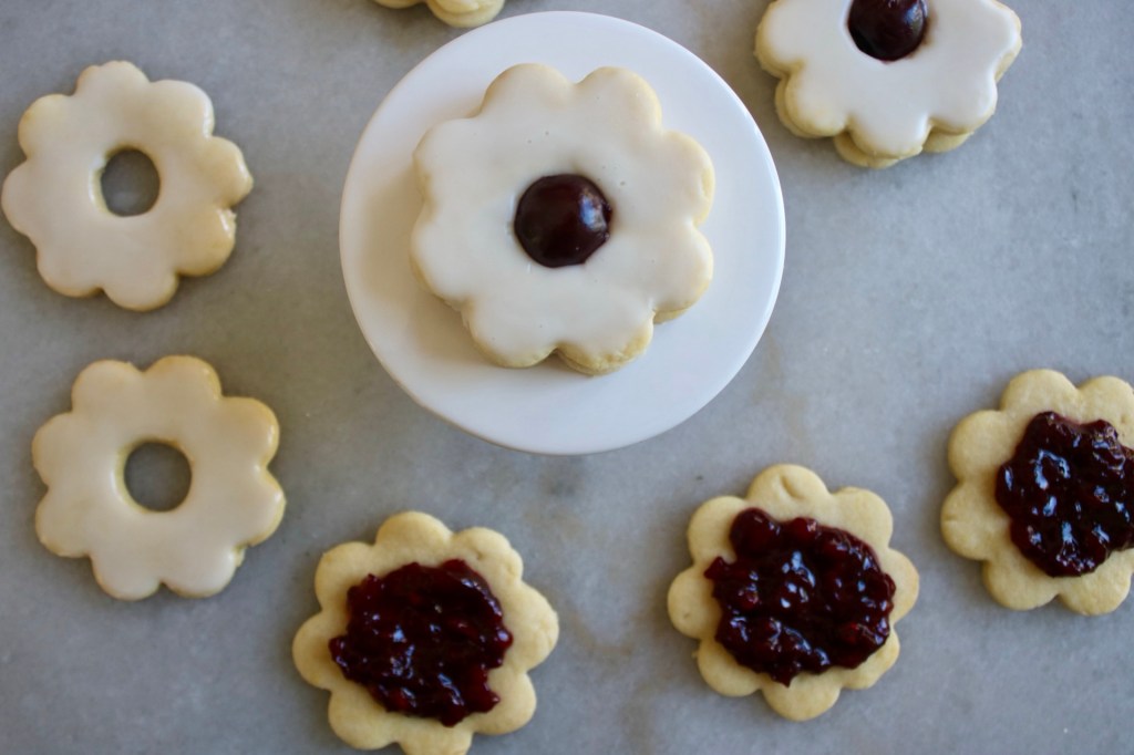 A bouquet of buttery almond flowers sandwiched with cherry jam. # 348: Cherry Bakewell Linzer Cookies