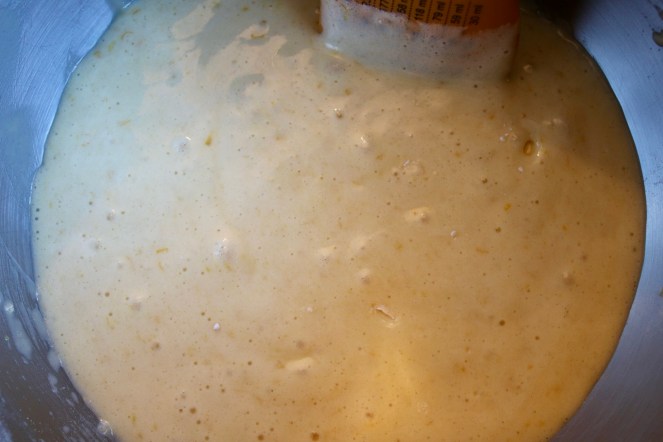 Isn’t it cool how you can see the surface tension around the edges of the flour pile? The egg mixture is so fluffy and full of air bubbles that it looks like a plush pillow.