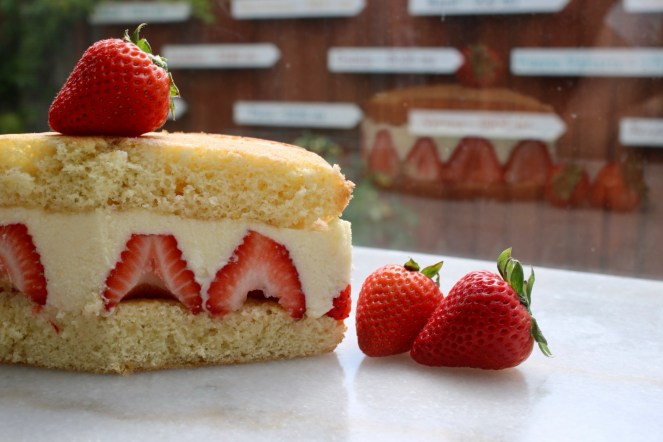 Some of the tall strawberries had to get a haircut to give the top layer of cake a flat surface.